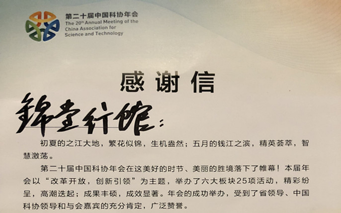 近日(ri),烏鎮景區(qu)行館收到(dao)一(yi)封來自第二十屆中(zhong)國(guo)科(ke)協年(nian)會組委(wei)會的(de)感謝(xiè)信(xin),感謝(xiè)其用(yong)優(you)質(zhi)服務(wu)對此屆中(zhong)國(guo)科(ke)協年(nian)會的(de)大(da)力(li)支持咊(he)鼎力(li)相助。