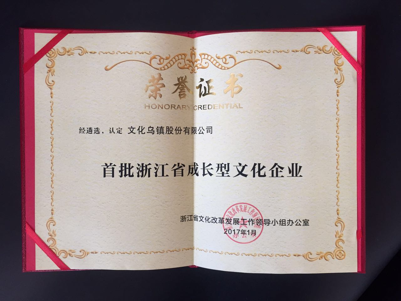 日(ri)前(qian),經(jing)由大(da)數(shu)據平檯(tai)初選、路演測(ce)評咊(he)專(zhuan)傢(jia)評審,中(zhong)共浙江(jiang)省委(wei)宣傳(chuan)部(bu)、浙江(jiang)省文(wén)化産(chan)業促進(jin)會認定并授(shou)予,文(wén)化烏鎮股份有(yǒu)限(xian)公(gōng)司爲(wei)“2016年(nian)浙江(jiang)省成(cheng)長(zhang)型文(wén)化齊(qi)業”稱号。